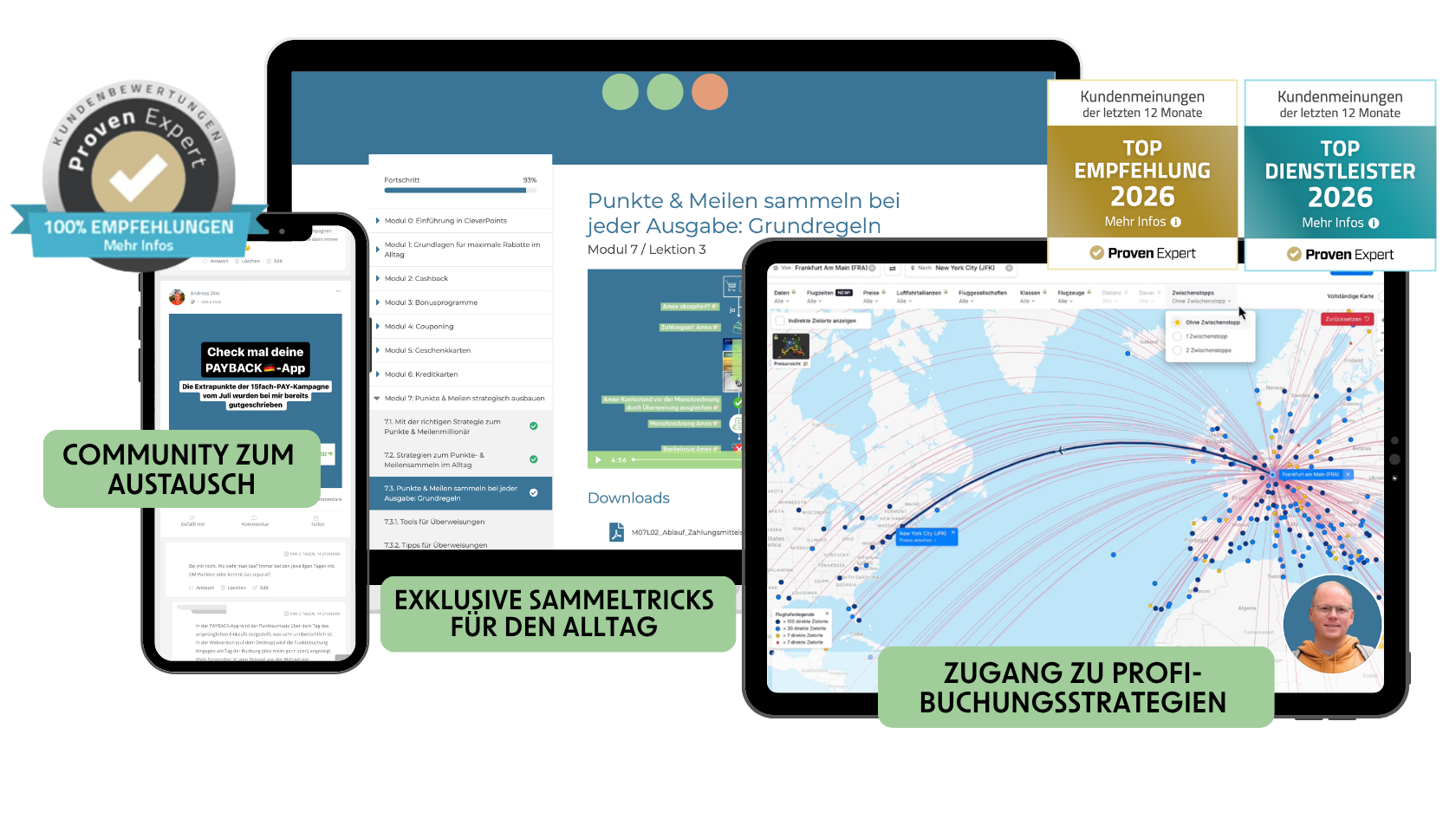 Im CleverPoints Masterkurs lernst du Schritt für Schritt, wie du aus deinen täglichen Ausgaben das Maximum herausholst, dir planbar 6-stellige Punkte- und Meilensummen pro Jahr aufbaust und damit Urlaube finanzierst, für die andere den vollen Preis zahlen.